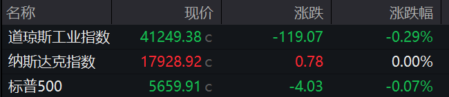 当地时间上周五,美股三大指数涨跌不一。截至收盘,道指跌0.29%,报41249.38点;标普500指数跌0.07%,报5659.91点;纳指平收,报17928.92点。