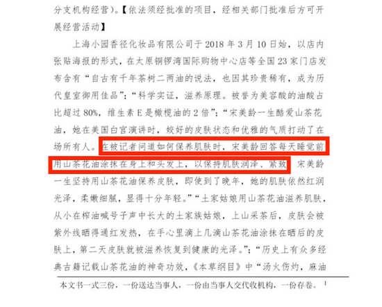 更荒唐的闹剧发生在2019年。林清轩旗下上海小园香径公司在23家门店张贴海报,宣称产品有“千年皇室御用”“治疗疮疖”等神奇功效,甚至搬出“宋美龄用山茶花油保养”的伪历史。
